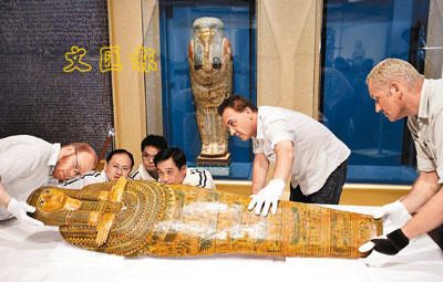 ■「不幸的木乃伊」棺材蓋,由大英博物館及藝術館的專家檢查有否毀損。後方是人形內棺。本報記者潘達文 攝