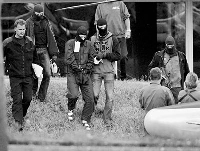 ■德國警方周二拘捕的其中一名疑犯,被蒙頭鎖上手銬帶離現場。美聯社