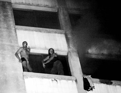 ■兩名遊客從充斥濃煙的房間爬過隔鄰房窗台。美聯社