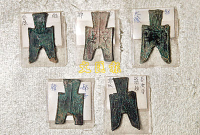 ■已有二千多年歷史的尖足布,呈現銅綠。