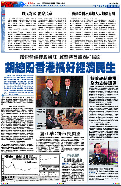 曾蔭權昨日早上到達胡錦濤下榻的酒店,兩人共進早餐,並交談約50分鐘。胡錦濤對香港特區新一屆政府工作給予充分肯定。他表示,近期香港總體形勢不錯:「經濟保持續增長,樓市股市也比較暢旺,失業率也下來了,只有百分之四點一,是9年來的最低位。」