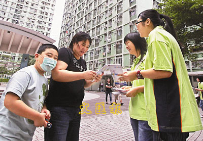 ■東區防止自毀工作小組昨日在柴灣派發傳單。本報記者曾慶威 攝