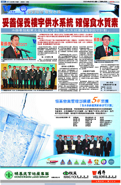 今年的「食水系統優質維修認可計劃」證書頒發典禮上,共頒發了1805張證書,其中包括住宅樓宇、工/商業樓宇、政府公共服務及各類機構的樓宇、醫院/護老院、學校及酒店等(見附表)。持有有效證書的住戶數目亦逐年遞增,由2003年3月的5萬多戶,增至2007年8月的約41萬戶,可見香港人對食水供應質素愈來愈關注。