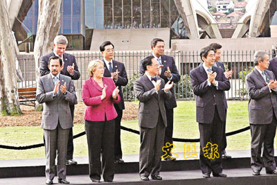 ■9日下午,APEC第十五次領導人非正式會議結束,中國國家主席胡錦濤與其他20名經濟體成員領導人,共同出席在悉尼歌劇院草坪上舉行的簡短閉幕儀式。 中新社