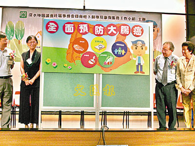 最近,大腸癌不但奪去幾位名人的生命,而患病人數亦有上升趨勢,成為本港第2常見的癌症,惹起社會關注。有見及此,深水步區議會及明愛醫院腸胃科部門,聯同多個機構,從7月份開始攜手推廣預防大腸癌的計劃。首階段的計劃包括派發宣傳單張,並訓練38位健康大使協助,以及由明愛醫院腸胃科醫生到社區中心進行講解,讓大家對大腸癌有確切正式的常識及理解。