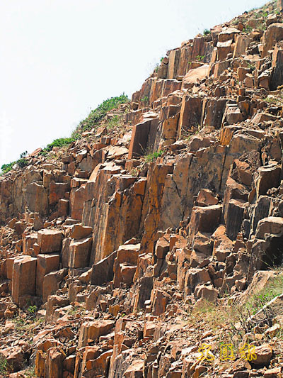■呈六邊形的柱狀岩石,聳立於萬宜水庫的東壩。本報記者羅敬文 攝