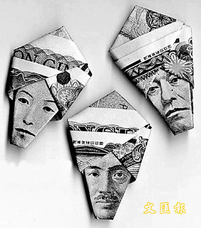 千圓紙鈔摺出來的「頭巾野口」。 網上圖片
