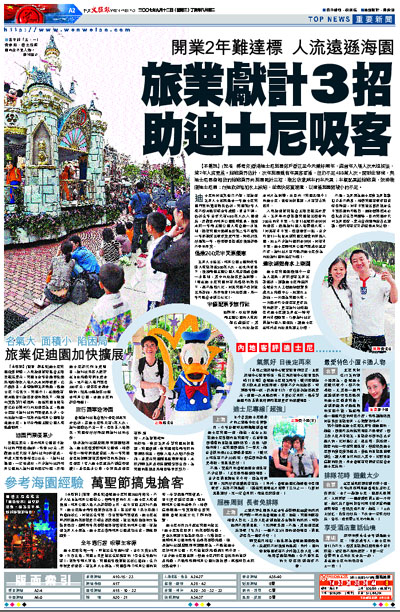 【本報訊】(記者 郝君兒)香港迪士尼樂園落戶香江至今天剛好兩年,繼首年入場人次未達標後,第2年人流更差。旅遊業界估計,次年樂園雖有年票客幫補,但仍不足480萬人次。面對此窘境,與迪士尼唇齒相依的旅遊業界向樂園獻計三招:推出收費減半的半天票;半價配票給旅遊業,鼓勵推廣迪士尼團;在迪欣湖增加水上設施,並盡快落實擴建,以彌補樂園面積小的不足。