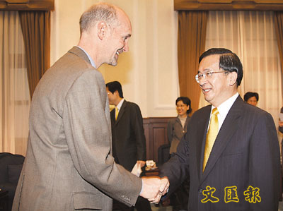■陳水扁(右)第四度致函聯合國遭到退回。圖為他11日在「總統府」會見外國客人。中央社