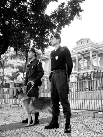 「第9屆粵港澳三地警方刑事技術部門對口業務交流會議」本月12日在澳門旅遊活動中心舉行。來自粵、港、澳三地的刑事技術專家就8項專門的刑事技術,包括犯罪情況之搜集及處理、爆炸品拆除及處理技術、警犬技術、痕跡檢驗、法醫檢驗及鎗彈痕跡自動識別系統等,進行廣泛交流。圖為會議期間澳門警員攜帶警犬執勤。 本報駐澳門記者王海濤12日 電