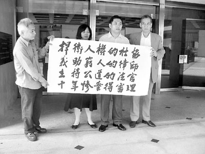 ■患有恐警症的青年胡樹彬(右二),日前在父母的陪同下,在高院外拉起橫額請願。資料圖片