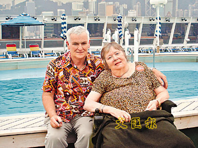 60多歲的Geoffrey Lang推著妻子Carole進入郵輪的餐室,小心翼翼地替行動不便的妻子泊好輪椅,餵她飲料。他們安頓後,我們才問兩位老人家何以如此熱衷於郵輪旅遊?何不選擇飛機或其他較快捷的交通工具?Carole在1978年因疾病導致半身不遂,而從事航空工作的Geoffrey便在1992年提早退休,全職照顧妻子。他們曾坐飛機到外地旅行,但由於太太行動不便,使旅程極其狼狽。後來發現郵輪假期的好處,可以免除收拾行李、轉換酒店之苦,可輕鬆地欣賞風光景色,又可落船遊遍各大城市的名勝古蹟,更可享用各種娛樂消閒設施。筆者還以為他們沒有小孩,所以毫無顧慮地以四海為家,但後來得知他們已有4名子女及8個孫兒。他們亦曾與家人一同旅遊,但子女即使身在郵船,心裡仍有牽掛,所以兩位老人家還是喜歡二人世界。