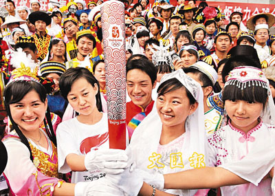 ■與大陸人民一樣,台灣民眾一樣期盼奧運聖火入島傳遞。圖為月前在寧夏銀川市,各民族大學生迎接奧運聖火。資料圖片