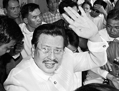 ■埃斯特拉達昨日被判貪污罪成囚終身,離開法庭時向支持者揮手。路透社