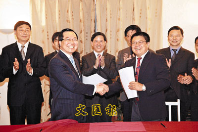 ■中聯石化子公司與陜西延長石油代表在馬國簽定投資合作開發馬國油田備忘錄。中聯石化主席許智明博士(前排左)和陝西延長石油副總經理馮大偉(前排右)握手祝賀。