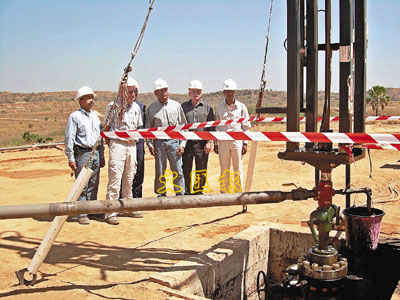 ■在石油專家的努力下,馬國油田經已出油並開始進行原油的試驗性開採。圖為馬國國家戰略與工業發展署官員和石油工程技術人員在油田觀察開採出原油的情況。