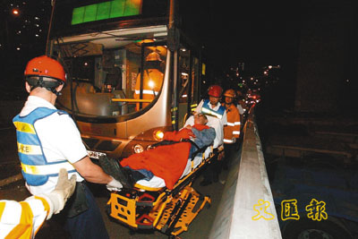 ■九巴失控撞壆,釀23人受傷,消防員正將其中一名傷者救出送院。