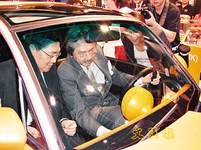 ■曾俊華與馬時亨對首輛港產汽車很有興趣,仔細研究。 本報記者葉傲冬 攝
