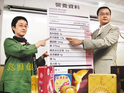 【本報訊】(記者 鄭佩琪)中秋節將至,月餅是應節食品,但消費者在選購時,應留意月餅是否含有可引致心血管病、糖尿病的反式脂肪。關注食物質素組織「良食關注組」指出,因本港未有食物營養標籤法例,大部分月餅製造廠不會主動列出產品含反式脂肪,他們促請政府盡快向立法會提交營養標籤法例草案,並必須將反式脂肪列入標籤中,保障市民健康知情及選擇權。