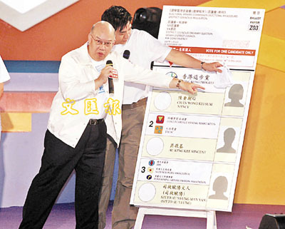 ■彭鍵基介紹如何填劃區議會選舉的選票。 本報記者劉國權 攝