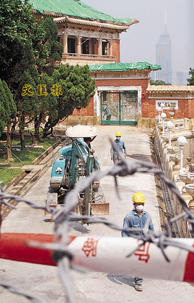 ■政府昨緊急刊憲,正式將擁有70年歷史的景賢里列作暫定古蹟,一年內不能清拆,早上地盤工人已停工,陸續運走泥頭車及清理建築物廢料。本報記者潘政祁 攝