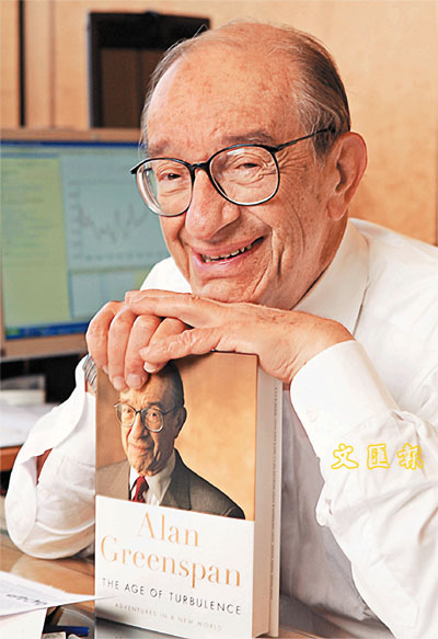 ■聯儲局前主席格林斯潘與他回憶錄《動盪的年代:新世界中的冒險》。網上圖片