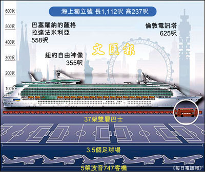 「海上獨立號」高340米,長度相等於3.5個標準足球場,比「瑪麗王后二號」還要大,可載4,375名乘客及1,000名船員。輪上餐廳林立,分佈於3層,共可容納2,000人同時用膳。康樂設施一應俱全,包括攀爬牆、溜冰場、戲院及大型健身室。「海上獨立號」明年5月在英國啟用,應付日益增長的郵輪服務需求。