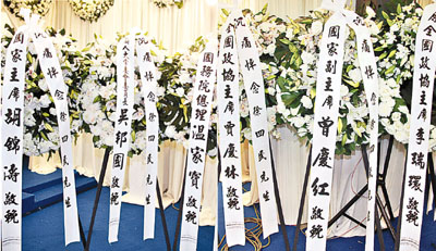 ■胡錦濤、吳邦國、溫家寶、賈慶林、曾慶紅、李瑞環等中央領導人致送的花圈擺放在靈堂的顯著位置。