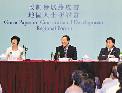 他續說,香港政制發展已經過社會的長時間討論,社會人士對於政制發展何去何從已有一定程度的認知,並非由零開始,而香港市民是務實進取的,對民主政制亦有深刻的認知,能夠表達自己的意見,不過,大家對政制發展的時間表、路線圖等問題仍存在一定分歧,而綠皮書的鋪陳及表述方式,正好讓香港人在多個重要問題上作出選擇,希望未來的政制發展路程能夠照顧社會各階層不同的利益。