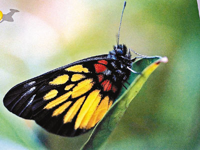特徵:翅底黑色,分別有紅、白、黃色的斑紋。展翅:7厘米(展翅是指兩翅平放後,由一邊翅端量度至另一邊翅端的長度)。