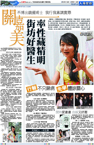 這個採訪,不是關嘉美想個人宣傳,是記者找她,不是她找記者。這又難怪,她的見報率高,每次在鏡頭前都打扮得鬼火咁靚,容易惹人誤會﹔更何況,鏡頭前的她言辭直率,有同行看不過眼,直指她博上鏡。但她從不認為自己出位,只是按著原則做事,覺得有些事情需要講就講,不吐不快。而鏡頭看不到的地方,她做人又夠實際,開診行街買衫吃飯,諗過度過,不慍不火。到沙士時,家人叫她不要做醫生,她怕「給公眾一個不好訊息」,加上為人樂觀,結果當然是繼續行醫。