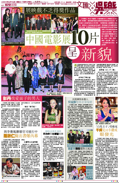 【本報訊】(記者 梁靜儀)「中國電影2007」前晚假文化中心舉行開幕禮,國家廣播電影電視總局電影局副局長張丕民、香港基本法委員會副主任梁愛詩、中聯辦宣傳文體部部長張延軍、康樂及文化事務署署長周達明、華南電影工作者聯合會理事長余倫、銀都機構有限公司董事長兼總經理宋岱及南方影業有限公司董事總經理劉德生擔任主禮嘉賓,其他出席的嘉賓有霍震霆及兩地影人劉佩琦、姜武、吳思遠、彭丹、狄龍、梁琤、薰妮、苗金鳳、林沖、十二位應屆候選亞姐等,場面熱鬧。呈新貌