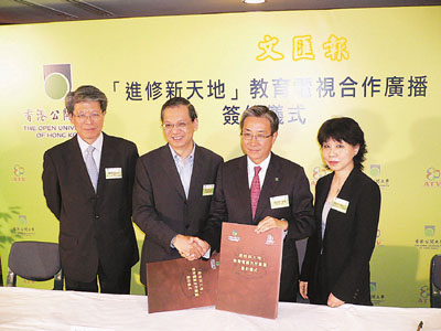 【本報訊】(記者 黃佩麗)亞洲電視與公開大學合作,將於下月七日在國際台播放《進修新天地》,並於昨日舉行簽約,由亞視董事兼營運總裁何定鈞和公開大學校長梁智仁代表簽署。