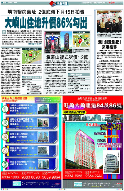 發展商積極勾地成功,地政總署昨公布,位於大嶼山長沙嶼南醫院舊址的住宅地成功以2億元勾出,相當於樓面地價2,800元,比去年6月勾出的長沙長富街地皮樓面地價1,500元高出86.6%,並將與另一幅位於香港仔惠褔道土地同於10月15日於香港文化中心拍賣。市場預期,此地皮的位置及景觀比去年佳,料成交價介乎2.7億至3億元,即樓面地價約4,000至4,200元。