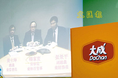■韓家寰(中)表示,大成食品不易受到雞肉價格升跌影響。本報記者張偉民 攝
