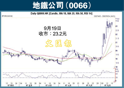 藍籌地產股成為昨日大升市的火車頭,恆隆地產(0101)大漲10.75%,而長實(0001)、信置(0083)則升超過7%,大價股像股仔般狂升,加上大升市成交急增,也反映市場資金流入有明顯加速的跡象。被視為半隻地產股的地鐵公司(0066)昨日亦跟隨大市造好,曾高見23.5元,收市報23.2元,僅升0.25元或1.09%,表現明顯跑輸大市,但亦因為股價相對落後,仍可作為追落後的選擇。