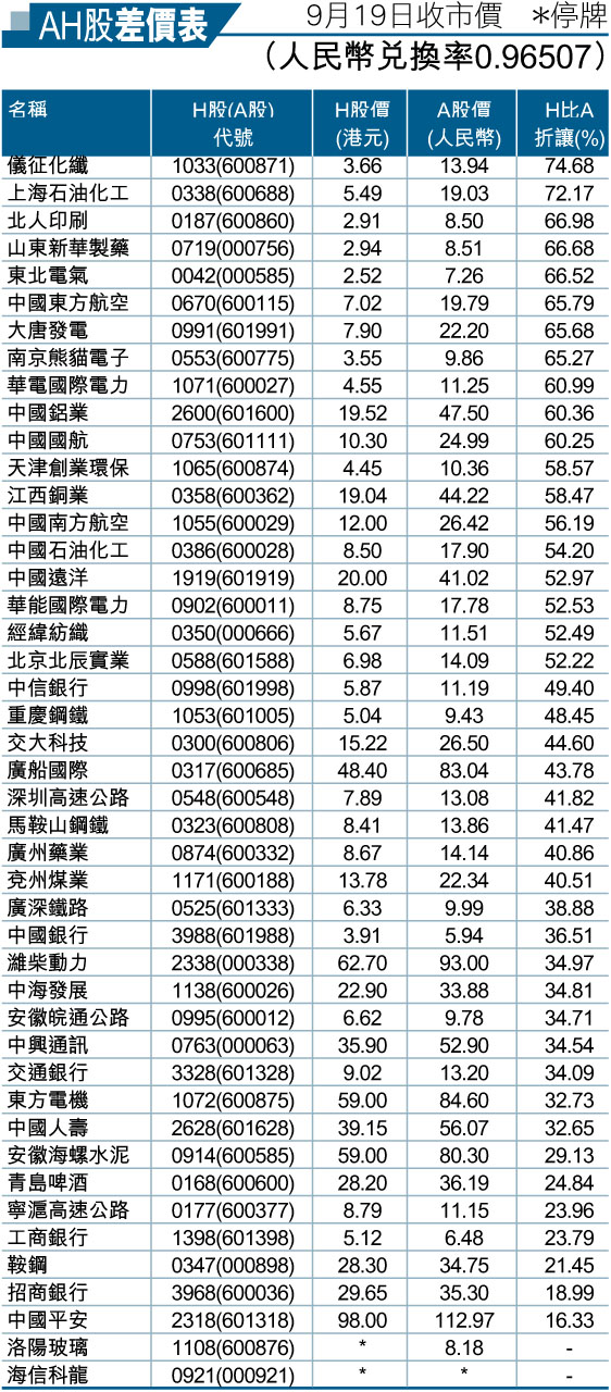 AH股差價表 9月19日收市價 (圖)