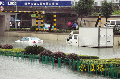 ■「韋帕」帶來的強降雨造成浙江省溫州市區部分道路深度積水。本報攝
