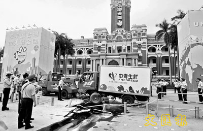 由於車速很快,在煞車不及下,密封式的生鮮貨車,越過不鏽鋼的欄杆與路障,向「總統府」前「加入聯合國」看板方向衝撞,隨後,肇事車輛翻覆在廣場前,擋風玻璃破損碎裂一地,車頭凹陷,也有機油洩漏在地面。