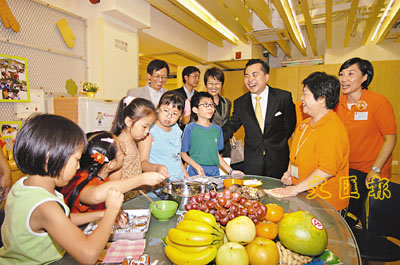 ■黃仁龍(右三)在香港青年協會橫頭磡「青年空間」與一群小學生暢談甚歡。