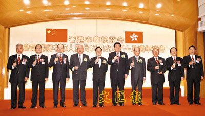 ■左起:楊釗副會長,蔡冠深副會長,霍震寰會長,全國政協副主席董建華,行政長官曾蔭權,中聯辦主任高祀仁,新任外交部駐港副特派員詹永新,副會長林廣兆、張成雄、林銘森在國慶酒會上祝酒。本報記者潘政祁 攝