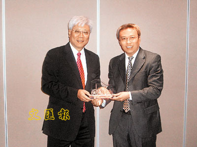 ■洪克協(左)致送紀念品予研討班班長陳富韜。