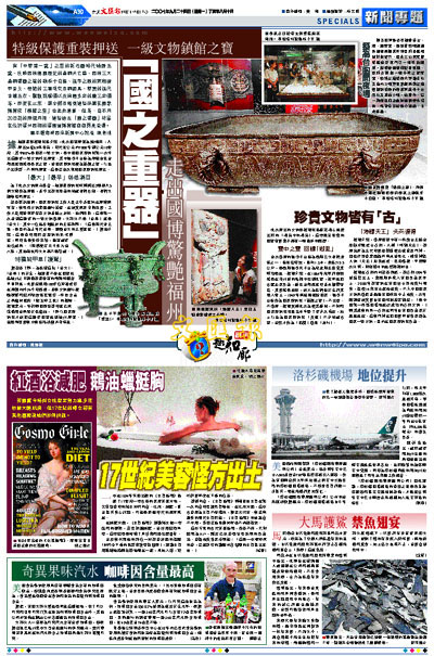 有「中華第一龍」之譽的新石器時代蜷體玉龍、反映西周建國歷史的青銅天亡簋、西周三大青銅重器之首的虢季子白盤、漢字之源的商殷墟甲骨文、奇詭的三星堆突目銅面具、華貴的漢代金縷玉衣、擊鼓說唱俑以及絢麗多彩的唐三彩俑等。即使在北京,想全部目睹到這些深藏在國家博物院「鎮館之寶」也並非易事,但是,自本月20日起的兩個月裡,這些遠古「國之重器」珍品在位於福州西湖的福建省博物館齊齊閃亮登場。
