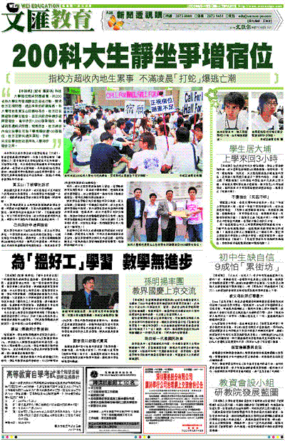 【本報訊】(記者 羅賀琪) 科技大學宿位短缺問題嚴重,約200名科大學生昨發起靜坐及簽名行動,要求校方正視問題,提出有效的紓緩措施。科大署理校長黃玉山回應時表示,校方已在興建新的學生宿舍,並正向政府申請多建兩座宿舍,當中涉及1,050個新宿位,希望能長遠解決問題;短期而言,校方減收內地交流學生可為下學期騰空逾100個宿位,校方正研究提供津貼,予研究生在學校附近租用私人屋苑作宿舍之用。