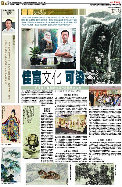 在海內外資深鑒藏家的鼓勵和支援下,佳富於2007年春拍響第一槌,首拍以逾千萬元的拍品成交金額躍居本地拍賣業之前列,成績顯赫。令人不由得佩服其行政總裁謝安寧的藝術素養和經營之道。