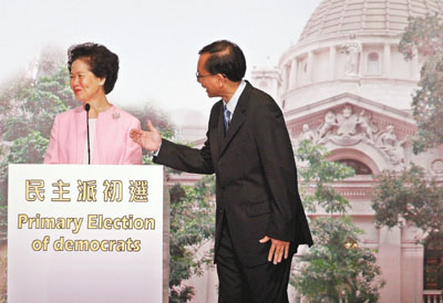 ■勞永樂與陳方安生結束火花四濺的辯論後向陳太伸出友誼之手。 本報記者曾慶威 攝