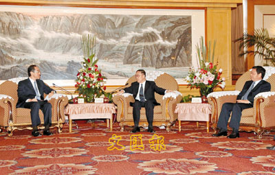 ■唐英年(左)與李鴻忠(中)就共同關心的課題交換意見,出席的還有深圳市市長許宗衡(右)。