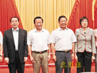 ■海南省委書記衛留成(右二)與李嘉誠基金會代表羅慧芳(右一)、李玉光(左一)等合影留念。本報海南傳真