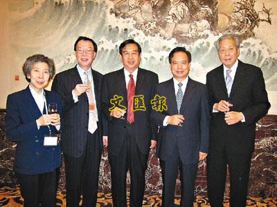 ■考察團「首腦」與山東省委書記李建國合影。由左至右為考察團副團長伍淑清、團長劉漢銓、全國政協副主席李蒙、山東省委書記李建國、副團長施子清。