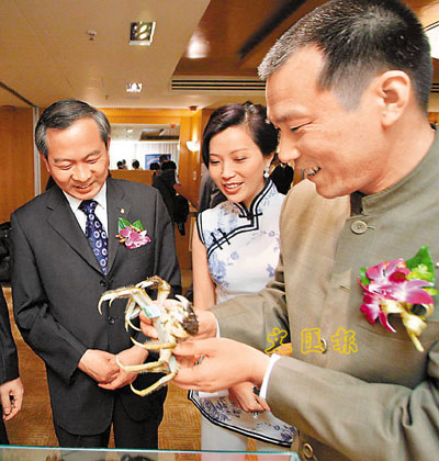 ■吳江市副書記范建坤(左一)來港推介東太湖生態蟹。